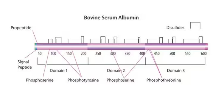 BSA is a single polypeptide chain consisting of about 583 amino acid residues and no carbohydrates. At pH 5-7 it contains 17 intrachain disulfide bridges and 1 sulfhydryl group.