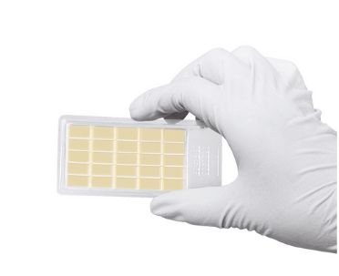 Each contact slide is individually sealed in the transparent and flexible primary backing film made from PET and provides a rectangular surface of 25 cm2.