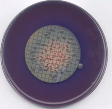 Blue coloured colonies on the membrane filter are counted as faecal coliforms. Other organisms form grey to cream colonies.