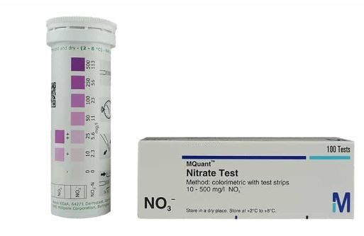 Method: Colorimetric, with test strips, 10 – 25 – 50 – 100 – 250 – 500 mg/L (NO3–), MQuant®